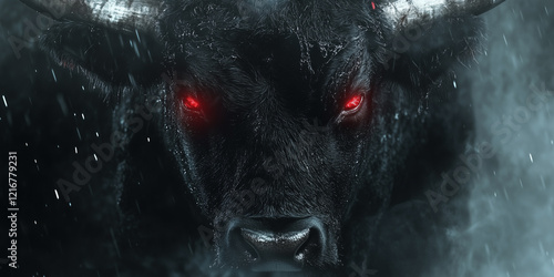 Fototapeta premium Dark and Powerful Bull With Glowing Red Eyes in Dramatic Atmosphere