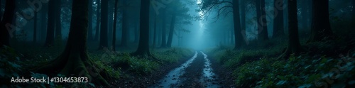 © YASUMIN, Fototapeta premium Dark and spooky pathway in the woods shrouded in shadows, eerie, fantasy