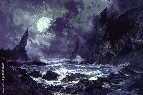 Fototapeta premium Dark and stormy night at sea with large waves crashing against sharp rocks