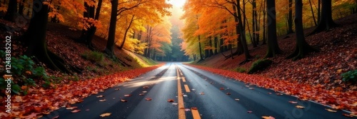 Fototapeta premium Dark asphalt, colorful autumn leaves on road, forest backdrop , light, glossy, photography