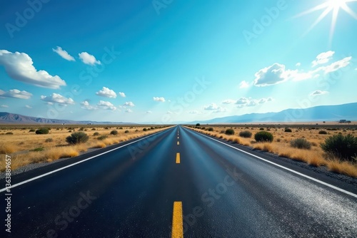 Naklejka premium Dark asphalt ribbon stretches to horizon under vast blue sky, clear sky, blue...