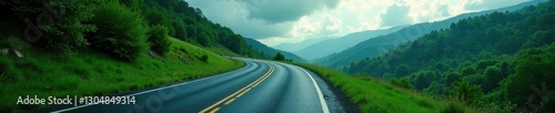 Fototapeta premium Dark asphalt ribbon winds through vibrant emerald forest, dramatic cloudscape...