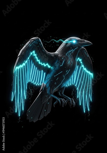 Fototapeta premium Dark avian creature exhibits glowing neon light patterns across its form...