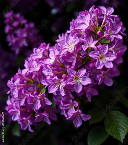 © retirementfun, Fototapeta premium Dark backdrop, vibrant lilac Syringa blossoms in full bloom, flowering, perfume, macro