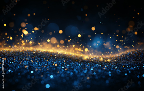 © Husnain, Obraz premium Dark background, bokeh lights on the ground, a dark blue and gold color theme, blurry, particles flying in the air.