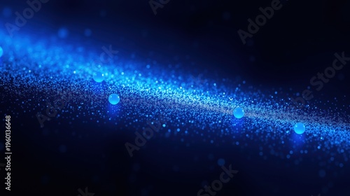 Fototapeta premium Dark background features bright blue particles, creating glowing wave effect. Subtle spheres add depth, suggesting cosmic energy flow.