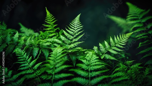 © Giovanni, Obraz premium Dark background featuring a close-up of natural green fern leaves texture in the forest.