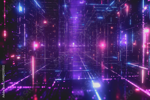 Obraz premium Dark background with a futuristic holographic network grid, and blue and purple neon light lines.
