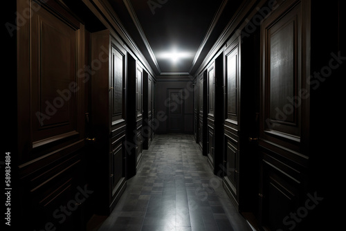 Fototapeta premium Dark backroom, many ways empty and labyrinth. AI generative.