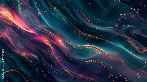 © javier, Fototapeta premium Dark base with liquid magenta and teal patterns glowing gold accents light beams. background