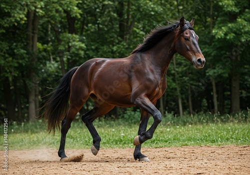 Fototapeta premium Dark Bay Horse Cantering, Forest Backdrop