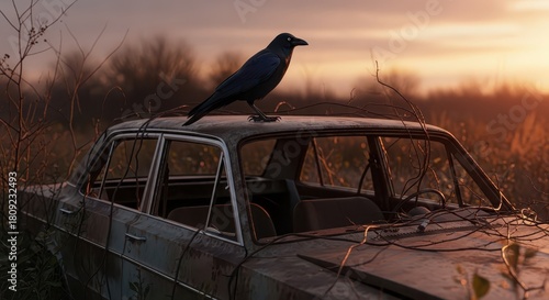 © Hungarian, Obraz premium Dark bird rests upon the roof of a derelict automobile abandoned in a field at sunset
