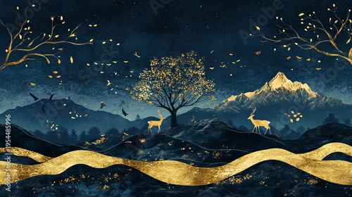 © Umer, Obraz premium Dark blue christmas forest mural with gold waves deer and mountain scene