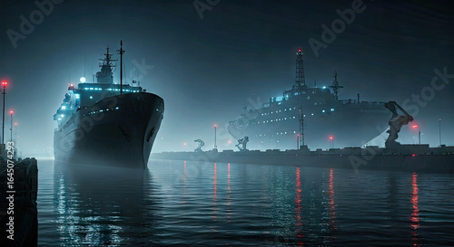 © Wanix, Obraz premium Dark Blue Cruise Ships Docked at Night Reflecting Red Lights in Water