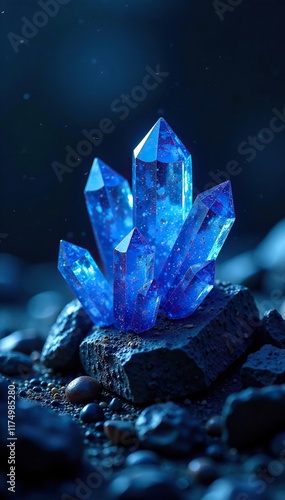 © Sutasinee, Obraz premium Dark blue crystal formation with shimmering, iridescent reflections on a textured background, luminous, iridescence