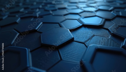 © Vadym, Obraz premium Dark blue 3D hexagonal pattern. Geometric abstract design tech background. Digital art, modern futuristic structure. Tech, cyber, web, UI, UX, data visualization, science, engineering design,