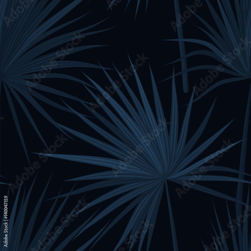 © Ms.Moloko, Fototapeta premium Dark blue denim floral pattern with exotic plants and palm leaves. Seamless vector fabric design.