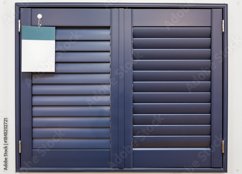 Fototapeta premium Dark blue folding plantation shutters covering a window with a blank sample tag, showing home decor and privacy