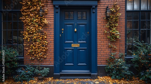Naklejka premium Dark Blue Front Door on a Red Brick Building with Autumn Leaves