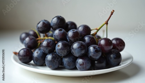 © miss irine, Fototapeta premium Dark blue grapes with stem sit on white plate. Bunch of ripe fruit with dew drops looks fresh and healthy. Suitable for food blogs recipes or juice ads.