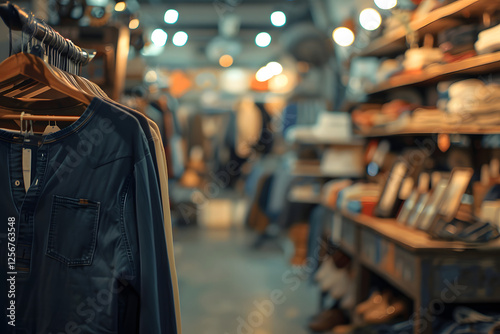 © DeepView, Obraz premium Dark Blue Long-Sleeve Shirt on Hanger in Clothing Store
