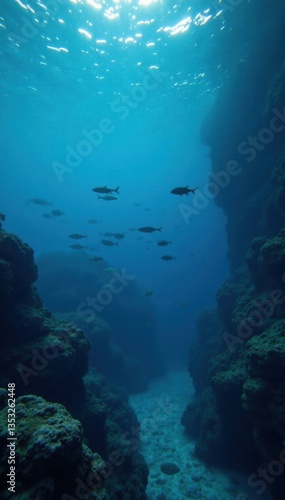 © Phennapha, Fototapeta premium Dark blue ocean surface reflected in a school of fish swimming beneath, ocean, water, blue