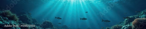 © Nook, Fototapeta premium Dark blue ocean surface with scattered fish and seaweed, reflection, blue