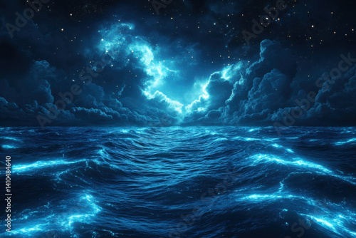 © Natalia, Fototapeta premium Dark blue ocean under a starry sky with wispy clouds.