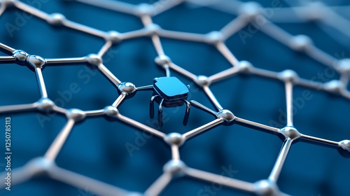 Fototapeta premium Dark Blue Robot Navigating a Metallic Hexagonal Network