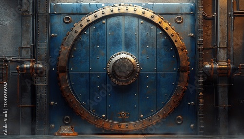 © Selvi, Fototapeta premium Dark Blue Rusted Metal Vault Door with Circular Gear Texture