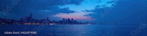 © Katherina, Obraz premium Dark blue sky with silhouetted cityscape and sea , skyline, night