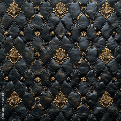 © Yothin, Naklejka premium Dark Blue Tufted Upholstery with Gold Floral Accents