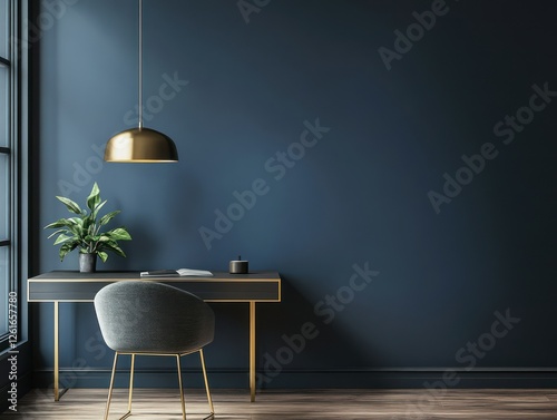 © kucret, Fototapeta premium Dark blue wall home office desk chair