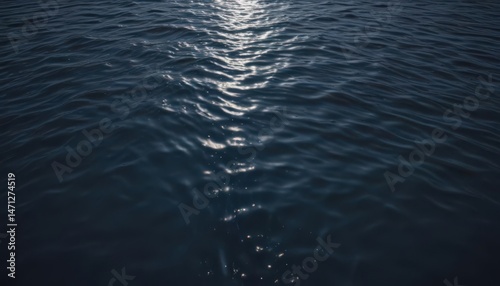 Naklejka premium Dark blue water surface, sunlight dappled above, aquatic plants, sun