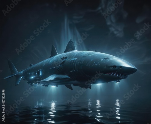 © Sayfar, Fototapeta premium Dark blue water with a shark-like submarine hovering above it, shining bright with bioluminescent lights , mysterious depths , underwater lighting