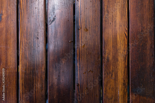 © Alexander, Naklejka premium Dark brown boards background with spots. Old wet wood texture pattern after rain with reflections