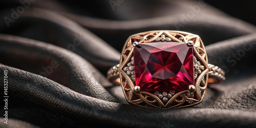 © Buakung, Obraz premium Dark brown diamond cut cushion style ruby gemstone on black velvet background with intricate gold filigree and subtle sparkle, filigree, sparkle