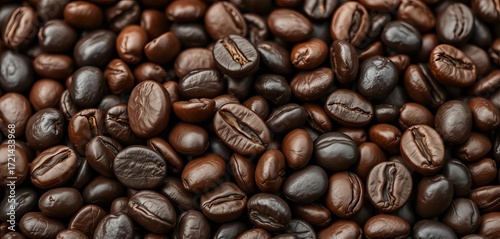 Obraz premium Dark brown, oily roasted coffee beans, close-up texture, brown background,...