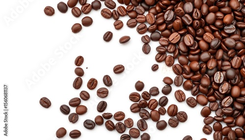 © Margo B, Naklejka premium Dark brown roasted coffee beans scattered on white background, macro, still life