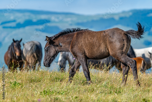 © Mustafa, Fototapeta premium Dark brown wild foal walking on grassy hill in Livno, Bosnia