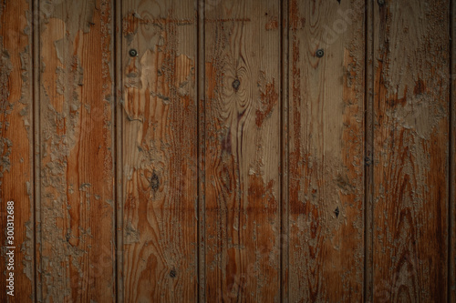 © Andrey, Naklejka premium Dark brown wooden boards with a worn surface. Old wooden background texture with vertical pattern.