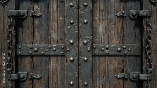 © Sakkarin, Fototapeta premium Dark brown wooden door with heavy black metal accents, rivets, and chains. Weathered texture, aged appearance