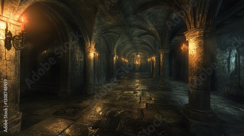 © rashyn, Fototapeta premium Dark castle crypt corridor, candlelight, stone walls, game background