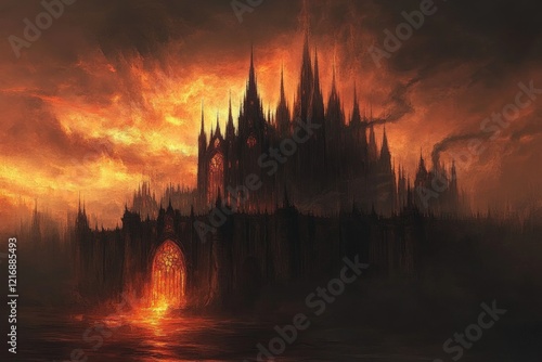 Obraz premium Dark castle rise from fiery landscape under ominous sky at twilight