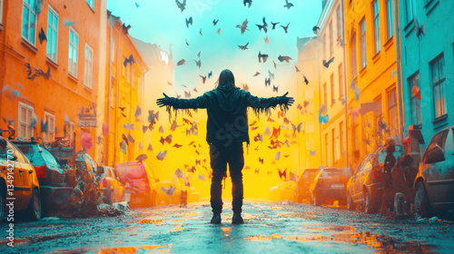 Obraz premium Dark chain pastel, A person standing in a pastel-colored Stockholm setting with high fidelity detail.
