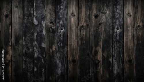 Naklejka premium Dark, charred wood planks exhibit vertical lines and rough, weathered...