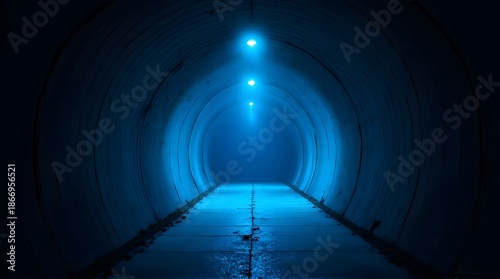 © Putri, Fototapeta premium Dark circular tunnel illuminated by three bright blue lights, with a wet, reflective floor leading into the distance.