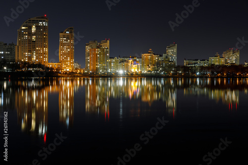 Fototapeta premium dark cityscape with illuminated buildings with reflection on water at night