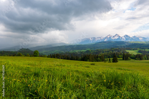 Fototapeta premium Dark clouds and rain storm over the rice field, rainy season in Tatras mountain poland