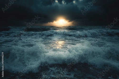 Obraz premium Dark Clouds and Waves Crashing on a Stormy Sea at Sunset